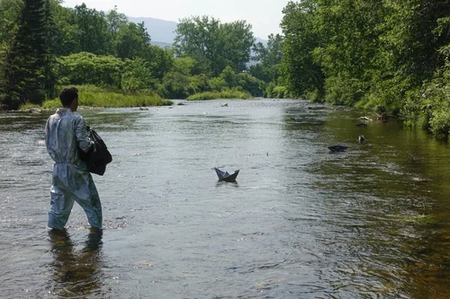 Ongoing. Floating downstream, slowly developing, always differently. Paper was coated with cyanotype solution, folded into paper boats, and floated downstream. Every individual trip is different; some boats sink immediately in a rough current, and others make it all the way downstream. Each unfolded piece is a record of this unique trip downstream.